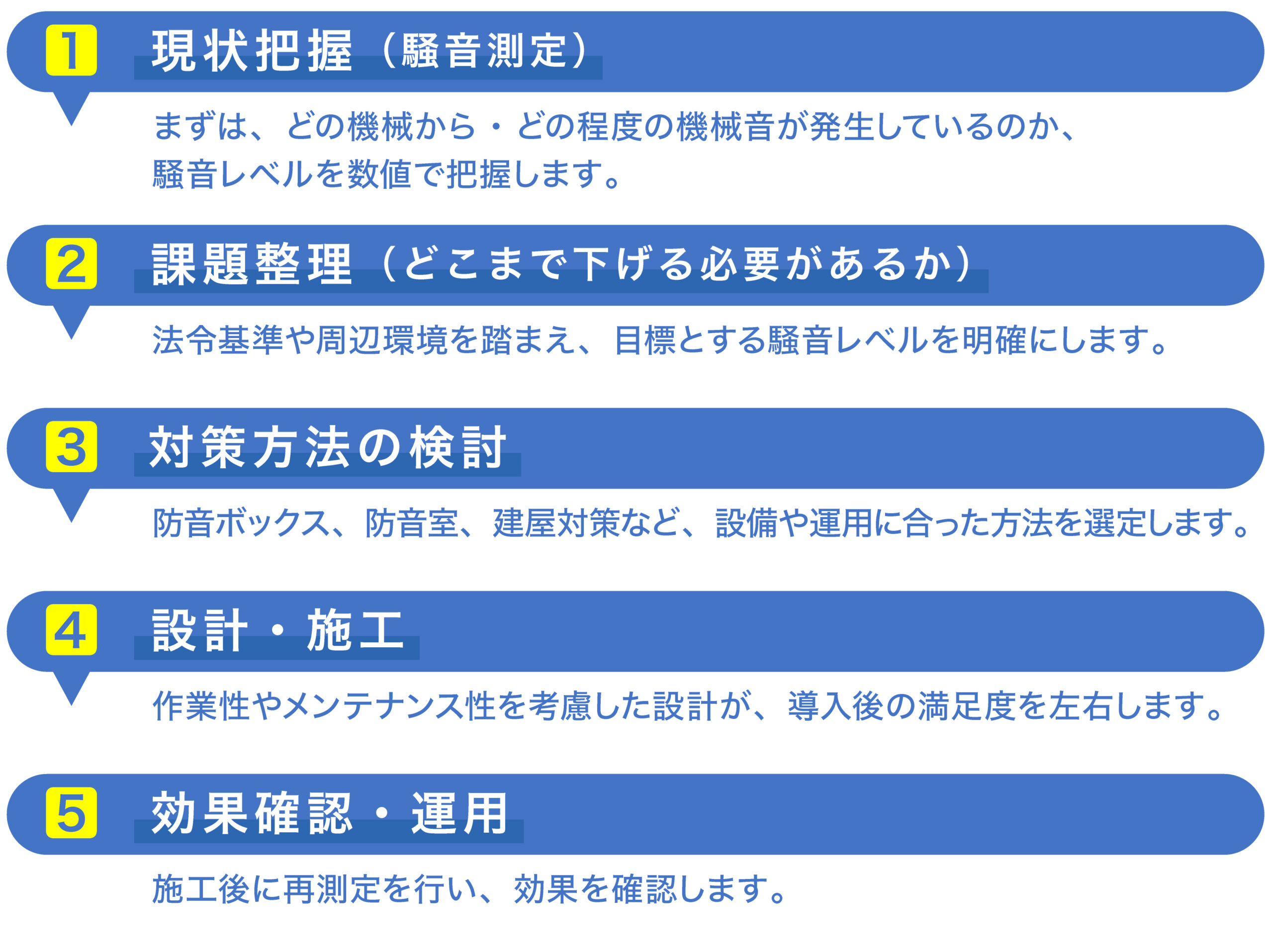 防音工事を成功させるためには、現状を把握し対策を講じるまで段階的な進め方が重要になります。